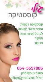 שלום שמי גילי ואני קוסמטיקאית מוסמכת , במהות שלי אני אוהבת לעזור לאנשים ובעיניי אין דרך טובה יותר לשפר את ההרגשה הפנימית מאשר לשפרה מהחוץ אל הפנים, אני מאמינה שנפש בריאה מתחילה בגוף בריא, כל אישה מטופחת תקרין את זה החוצה.1
